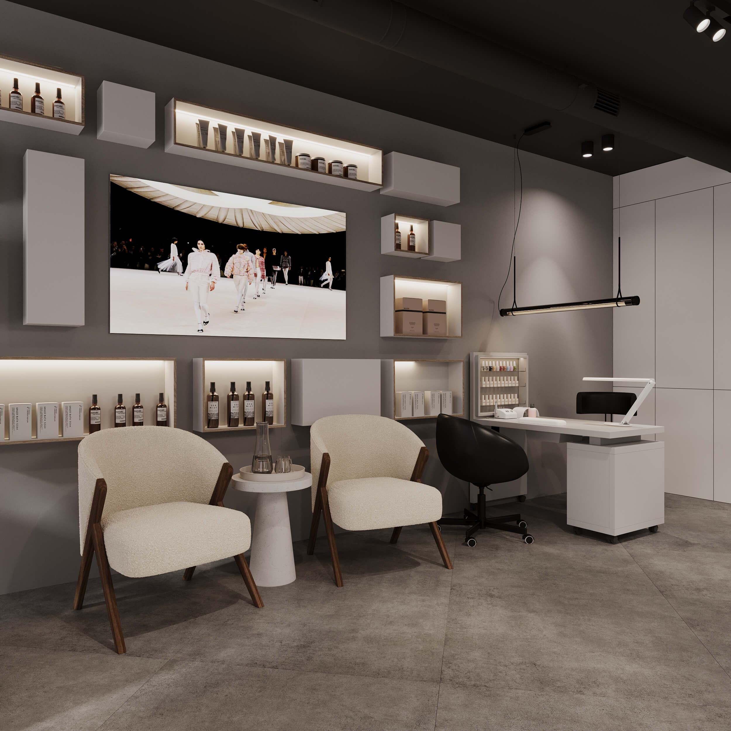 Виготовлене в Японії, воно використовуване для перукарських, нігтьових та б’юті-послуг. Це інноваційне рішення, яке дозволяє поєднати стрижку, манікюр, педикюр та косметичні процедури в одному місці, без необхідності переміщати клієнта. Такий підхід значно спрощує роботу майстрів, надаючи клієнту відчуття безперервності обслуговування.
